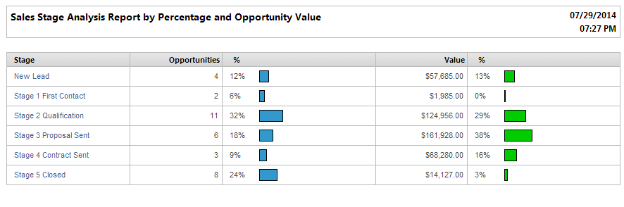 Importes y porcentaje de oportunidades en diferentes etapas del proceso de ventas. |