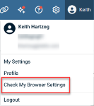 Puedes acceder a la utilidad de comprobación del explorador en cualquier momento. Desplace el cursor sobre su nombre en la esquina superior derecha de la barra de navegación para abrir el menú de usuario y seleccione Comprobar la configuración de mi explorador.