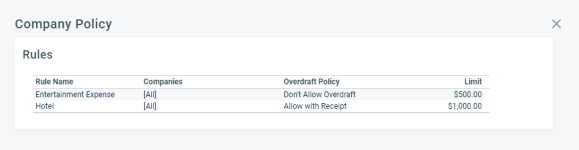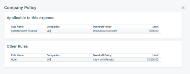 - En la página de Gastos, la regla que se aplica al gasto seleccionado se separa en la ventana emergente de la Política de Organización.