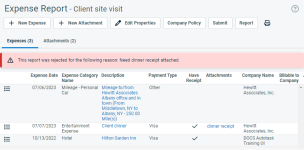 Seleccione para abrir un reporte de gastos. Los usuarios pueden ver sus propios reportes de gastos, mientras que los supervisores pueden además ver reportes de gastos de recursos que supervisen. Si usted es el recurso y el estado del reporte es En curso o Rechazado, podrá agregar o editar elementos de gastos y archivos adjuntos. Los informes rechazados mostrarán el motivo del rechazo en la parte superior de la página. Si usted es el supervisor se abrirá la página Aprobar o Rechazar reporte de gastos. Consulte Aprobar o rechazar reportes de gastos. |