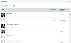 Para dejar de seguir a un compañero de trabajo, haga clic en Dejar de seguir en la columna Seguir/Dejar de seguir . Haga clic en Aceptar en el mensaje de confirmación.