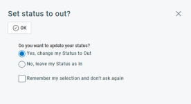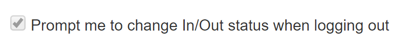 Para volver a activar el aviso, vaya a su página Míos > Varios > Configuraciones y seleccione la casilla de verificación Pedirme que cambie el estado de entrada/salida al iniciar sesión en la sección Usuario: