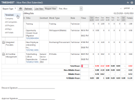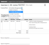 En la vista de reporte, usted puede usar distintos tipos y filtros para presentar información de hoja horaria, mostrar campos adicionales relacionados a facturación, e imprimir su hoja horaria.