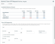La parte superior de la página muestra un resumen de sus horas de ausencia actuales hasta cuatro categorías, tales como vacaciones, tiempo de ausencia por enfermedad, etc.