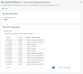 Bajo Saldo disponible, haga clic en el vínculo de saldo para abrir la página Mi saldo actual. La página Mi saldo actual muestra el saldo actual para la categoría de tiempo de ausencia indicada en la barra de título.