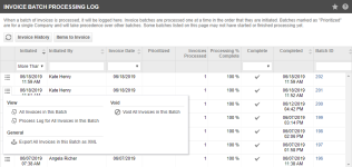 | Registro de proceso para todas las facturas en este lote | Abre un archivo .CSV de entradas de registro de proceso que solamente muestra las facturas en este lote. |