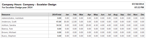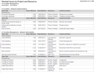 Horas de proyecto trabajadas para la organización seleccionada, por proyecto y recurso. Usted puede filtrar por proyecto, recurso, departamento e intervalo de fechas. |