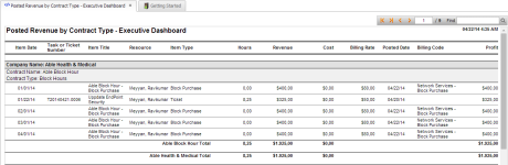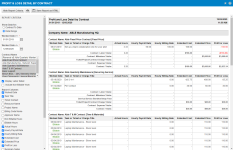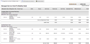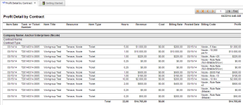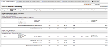Este reporte brinda una vista detallada de elementos de línea de ingresos, costo y ganancias, agrupados por empresa, contrato y servicio/paquete. |