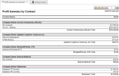 Una vista detallada de elemento de línea de ingresos, costo y ganancias, agrupados por contrato. Los datos pueden ser filtrados por fecha de contabilización. |