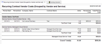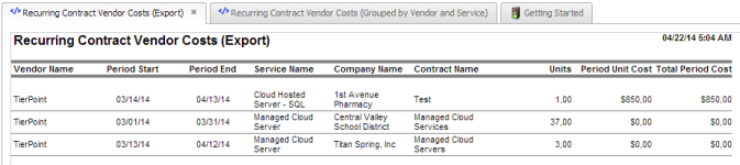 Tres reportes que muestran costos de proveedor para servicios que usted ofrece a clientes para determinar rentabilidad verdadera a nivel de contrato. |