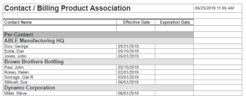 Los contactos con una asociación de productos de facturación basada en reglas, agrupados por producto de facturación y, a continuación, por organización. Incluye la fecha de entrada en vigencia y la fecha de expiración de la asociación. |