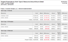 El costo y el importe facturados, las horas trabajadas y las horas facturadas, o todos los anteriores del/los proyecto(s) seleccionado(s), agrupados por tipo de trabajo y con totales por recurso.