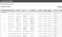 Todos los recursos activos e inactivos con todas las funciones y las tarifas de facturación, como también el costo interno, agrupados por departamento. |