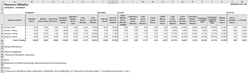 Las diferencias con el reporte estándar de Utilización de recursos se señalan en las descripciones de las columnas. Las más importantes son las siguientes: