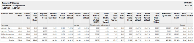 Las horas de los clientes pueden ser reportadas con o sin los ajustes realizados a las horas de mano de obra contabilizadas (o incluso facturadas). Consulte Ajustar elementos de mano de obra contabilizados.