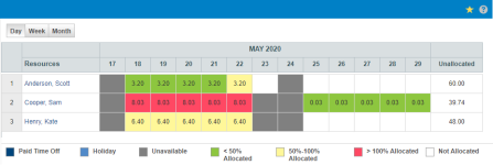 En la parte superior del reporte, los botones de conmutación le permiten seleccionar cómo desea ver la disponibilidad de recursos: por día, semana o mes.