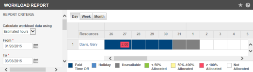 Cuando un recurso no esté disponible (de vacaciones o con tiempo de ausencia aprobado), y esté programado para una tarea cuya duración coincida completamente con el tiempo de no disponibilidad, la tarea aún aparecerá en el reporte de carga de trabajo, pero estará claro que se encuentra dentro de un período de tiempo no disponible. Las horas estimadas serán sombreadas en el color que indica que el recurso está > 100% asignado.