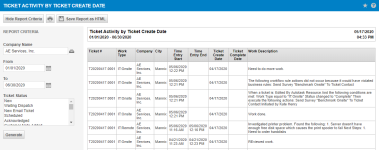 | Descripción | Título antiguo: Detalles del ticket por fecha Trabajo llevado a cabo y notas añadidas para tickets creados en el intervalo de fechas especificado. |