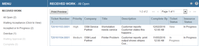 | Aceptado o en curso | Los tickets que son aceptados (su empresa ha aceptado el ticket, pero no ha comenzado aún el trabajo), o que están en curso (el trabajo ha comenzado). |