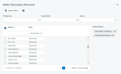 - Los campos Contactos adicionales y Recursos secundarios, que permiten la selección de varios nombres, presentan una versión del selector de datos de filtros avanzados.