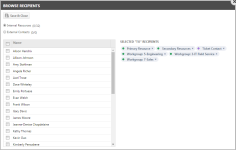 | Selector de tipos de destinatarios | Un botón de radio le permite ver ya sea Recursos internos (predeterminado) o bien Contactos externos. El primer número entre paréntesis indica el número de recursos o contactos seleccionados; el segundo, el número total de recursos o contactos de la tabla. Haga clic en un botón de radio para alternar entre las dos listas. |