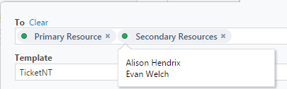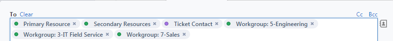 - Haga clic en la casilla Para para ver los destinatarios basados en función de la entidad y todos los grupos de trabajo activos. Cuando seleccione un destinatario basado en función, la persona actualmente asignada a la función recibirá la notificación. Los recursos internos y los grupos de trabajo se identifican con un punto verde, mientras que los contactos externos, con un punto morado.