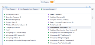 NOTA Muchos destinatarios basados en función aparecen en paneles de notificaciones para más de una entidad y cada entidad tiene sus propios y exclusivos destinatarios basados en función. Las imágenes en este tema se tomaron de notificaciones de tickets.