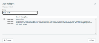 - Seleccione Alertas diarias como la entidad, haga clic en el widget Alerta de sistemas y haga clic en Siguiente.