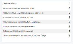 Autotask supervisa un grupo específico de actividades comunes en varias áreas. Cuando la función de alertas diarias está activada, su instancia de Autotask se comprueba una vez cada 24 horas para evaluar estas actividades rutinarias. Cuando sea aparente que una o más de estas actividades ha estado inactiva por mucho tiempo, o si un estado indica un problema potencial, se creará una alerta. Estas alertas están disponibles para visualización para cualquier usuario (su nivel de seguridad determina su acceso a datos de alerta).