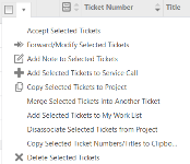 : brinda acceso a varias acciones que usted puede completar para cada elemento en la lista; por ejemplo, las acciones disponibles para tickets que pueden incluir abrir la vista de detalles del ticket o la página de edición, reenviar/modificar o copiar el ticket, o agregar una entrada de tiempo.