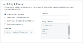 | Usar dirección de ubicación | Seleccione esta opción cuando desee que la Dirección de facturación de la factura muestre la dirección de la sede de una organización. Seleccione la ubicación pertinente desde el selector de datos, o haga clic en + para agregar una nueva ubicación. |