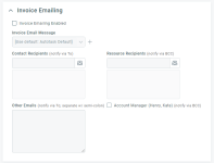 NOTA Usted puede también configurar los campos CC: y CCO: en el mensaje de correo electrónico de factura, el que es configurado por su administrador de Autotask. Autotask combina las configuraciones de destinatarios de ambos campos y luego quita los duplicados. Consulte Agregar o editar plantillas de mensajes de correo electrónico para facturas o cotizaciones. |