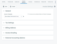 La pestaña Configuración de Facturación, donde puede personalizar la configuración de facturación para una organización individual, aparece en las pestañas de accesorios de la página Organización. Muestra los mismos campos que la página Configuración de factura asociada a la organización. Estas configuraciones serán usadas cuando genere facturas por medio del proceso de generación de facturas en lotes, y serán los valores predeterminados cuando genere una sola factura. Para abrir la página, use la(s) ruta(s) de acceso en la sección Seguridad y navegación más arriba.