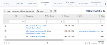 La pestaña Suborganizaciones aparece en las pestañas accesorias de la página Organización. En esta pestaña puede ver y gestionar las suborganizaciones existentes y crear otras nuevas. Para más información sobre las suborganizaciones y sus diferencias con las sedes, consulte Ubicación de las organizaciones y relaciones entre organizaciones matrices y suborganizaciones.
