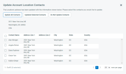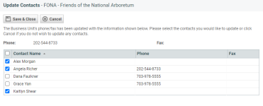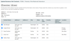 Después de realizar cambios en la dirección o el número de teléfono de la organización y hacer clic en Guardar, se abre la página Actualizar contactos de la organización, con una lista de todos los contactos asociados.![]()