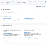 La pestaña Datos financieros de la página de la organizaciónbrinda un acceso rápido a un conjunto completo de reportes financieros para el cliente seleccionado actualmente. Dos grupos de reportes, los Reportes Financieros y los Reportes de Rentabilidad, le permiten ver las métricas de rentabilidad históricas, los datos de rentabilidad de los contratos y proyectos y los reportes sobre tiempo (facturable y no facturable) que sus recursos dedicaron a apoyar la organización.