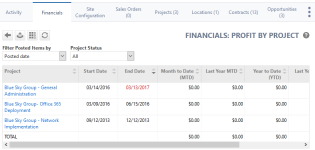 La tabla de beneficios por proyecto muestra información actual e histórica sobre los beneficios de los proyectos de la organización, y permite comparar las cifras del mes hasta la fecha y del año hasta la fecha con las del mismo periodo del año anterior. Para abrir la página, use la(s) ruta(s) de acceso en la sección Seguridad y navegación más arriba.