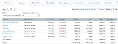 La tabla Rentabilidad por contrato le muestra los ingresos, costes, beneficios y rentabilidad por cada uno de los contratos de esta organización, lo que le permite ver no sólo lo rentable que es cada contrato, sino también la cantidad de ingresos que está realizando y los costes en los que está incurriendo por cada contrato. Para una descripción general de lo que se incluye, consulte Partidas de ingresos y costes incluidas a nivel de organización, contrato y proyecto.