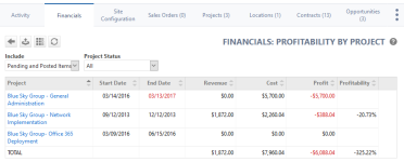 La tabla Rentabilidad por proyecto le muestra los ingresos, costes, beneficios y rentabilidad de cada uno de los proyectos de esta organización, lo que le permite ver no sólo lo rentable que es cada proyecto, sino también la cantidad de ingresos que está realizando y los costes en los que está incurriendo para cada proyecto. Para abrir la página, use la(s) ruta(s) de acceso en la sección Seguridad y navegación más arriba.