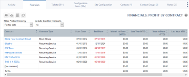 La tabla Ganancias por contrato muestra todas las ganancias de todos los ingresos y elementos de costo de contrato para el mes hasta la fecha y el año hasta la fecha, y compara estos números con los mismos períodos del año anterior para brindar una dimensión histórica a los números actuales. Para una descripción general de lo que se incluye, consulte Partidas de ingresos y costes incluidas a nivel de organización, contrato y proyecto.