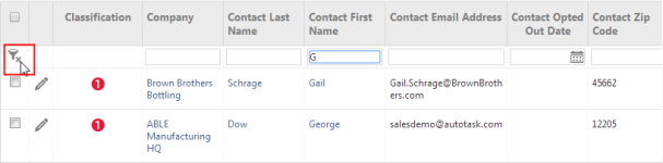 La cuadrícula conservará datos en los filtros de columna hasta que borre los campos del filtro, permitiendo que construir su búsqueda gradualmente. Si necesita filtrar columnas múltiples, se recomienda utilizar el Filtro avanzado. Consulte Usar el Filtro avanzado, a continuación.