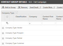 La etiqueta de la columna se mueve al lado izquierdo de la fila que se encuentra sobre los encabezados de columna. La tabla se reordena en grupos de contactos que comparten el mismo valor en la columna agrupar por; por ejemplo, si agrupa por una columna para el campo Tipo de organización, se agruparán todos los contactos que compartan el mismo tipo de organización.