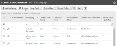 | Enviar correo electrónico | En Detalles del grupo de contactos, usted puede seleccionar una acción de contacto a ejecutar, es decir, enviar correos electrónicos, crear notas o crear tareas pendientes. Cuando seleccione una acción de contacto, se abrirá la página Acción de contacto para ejecutar las acciones seleccionadas para el grupo completo de contactos seleccionados. Para detalles, consulte Crear y ejecutar acciones de contactos. |