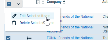 - En las tablas de tareas y notas con menú contextual, seleccione varias tareas o notas (marcando las casillas de la izquierda) y, a continuación, haga clic en el icono desplegable de la columna de selección y seleccione Editar elementos seleccionados.