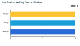 - Los nuevos dispositivos y los dispositivos creados por Datto BCDR, Datto Network Manager o Datto RMM han sido revisados para obtener la autorización de contrato. El estado de revisión de contrato está disponible como filtro en búsquedas y widgets de tablero como este en la pestaña de tablero Dispositivos de Datto RMM. Esto le permite identificar fácilmente cualquier elemento de configuración que no haya sido revisado.