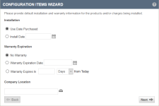 | Instalación | Si se ejecuta el asistente desde la página Elemento de cotización, se deshabilitará el botón de radio Usar fecha de compra, y la Fecha de instalación será seleccionada de modo predeterminado. Ingrese una fecha de instalación. Si el asistente es ejecutado desde la página Cargo, Usar fecha de compra es seleccionada de manera predeterminada. La fecha de compra a la que se hace mención es la fecha en la que el cargo de ticket, proyecto o contrato fue creado. |