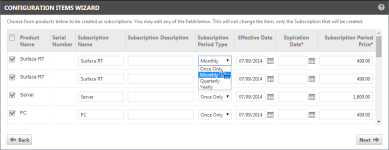 | Crear como página de suscripciones | Revise los elementos facturados (de suscripción) que serán creados para los productos que está instalando. Si usted inició el Asistente de elementos de configuración desde una cotización, los precios del período de suscripción son predeterminados desde la cotización, pero pueden editarse. Si está habilitada Multidivisa, el precio del período de suscripción aparece en la divisa del cliente. De manera predeterminada, todas las filas de productos serán seleccionadas para facturación, pero usted puede selectivamente desmarcar productos si no desea crear una suscripción de facturación. Para más información sobre la facturación de suscripciones, consulte Agregar o editar una suscripción de facturación. SUGERENCIA Práctica recomendada |