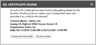- Si se encontró un certificado SSL para el dominio, le preguntaremos si desea crear automáticamente un elemento de configuración para el certificado SSL y asociarlo como elemento secundario al dominio recién creado.