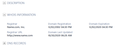 | Registro de dominio (Fecha de registro, Hora de registro) | La fecha y la hora en que el dominio se registró por primera vez. La fecha y la hora se muestran en la zona horaria local del usuario. |
