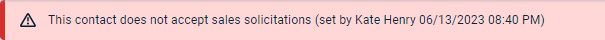 Si el contacto (o el contacto asociado con la oportunidad o la tarea pendiente que esté viendo o editando) ha optado por no recibir solicitudes de venta, usted verá un titular de página rosado al principio de la página. En una oportunidad, aparecerá este mensaje emergente si el contacto asociado ha optado por no recibir solicitudes de venta, incluso si el campo de contacto está oculto por la categoría de oportunidad.